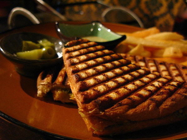 有一陣子,有些咖啡館會賣烤三明治。作法是拿兩片土司,包上餡料,然後用類似烤鬆餅的機器,壓住三明治烤熟。非常好吃,而且要熱的吃。