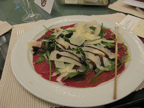 生牛肉冷盤Carpaccio的作法非常的簡單,切的薄薄的生牛瘦肉,灑點鹽、上面鋪上芝麻菜、片薄的起士片,在淋上用橄欖油、醋、切碎的洋蔥,然後一些隨製作者喜好的香料秘方便成了。重點在,肉要新鮮,切之前先冰凍一下。